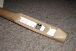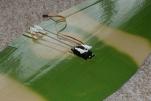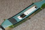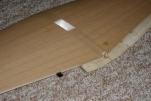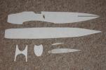 Stavba prebiehala rýchlo, vzhľadom na typ konštrukcie. Pomocou šablón som na odporovej píle vyrezal pôdorys a následne bokorys trupu. No a potom len brúsiť a brúsiť. Otvory pre akumulátory, servá a nádrž som vyrezal trafopájkovačkou pomocou prípravkov, ktoré som zhotovil z medeného drôtu. Vzniknutý